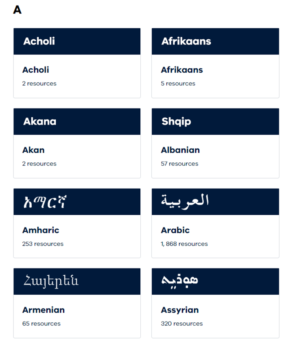 The Search by language allows citizens or healthcare professionals to see what resources are available in a specific language. Languages are displayed alphabetically, and the number of resources for each language is clearly displayed (see the screenshot below).