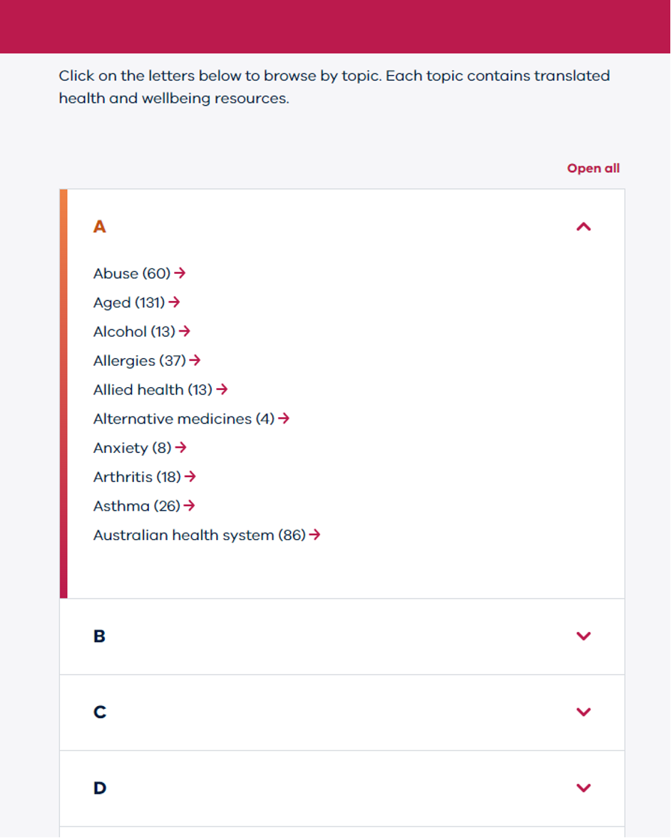 The Search by topic allows users to browse resources by topic. Listed alphabetically using accordions, the page loads with A expanded to see all the topics that start with the letter A. The number of results (resources) is also clearly displayed.