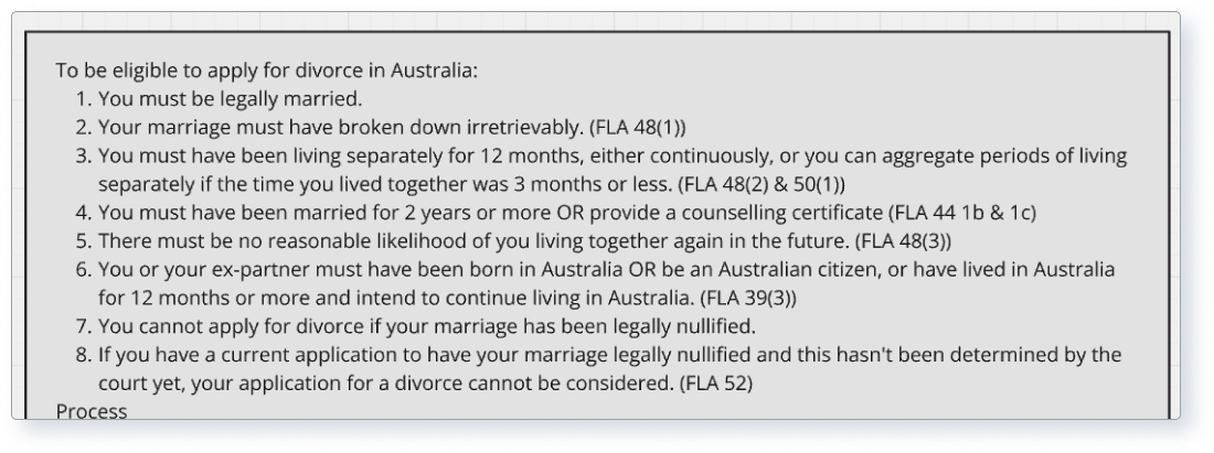 If someone wants to get a divorce in Australia, they need to read through several pages of detailed content on the Federal Circuit and Family Court of Australia’s . As part of the GovCMS Rules as Code , the Court wanted to explore if Rules as Code could be used for divorce eligibility. The goal was to improve the user journey by providing a short webform and then customised content that reflects people’s individual circumstances.