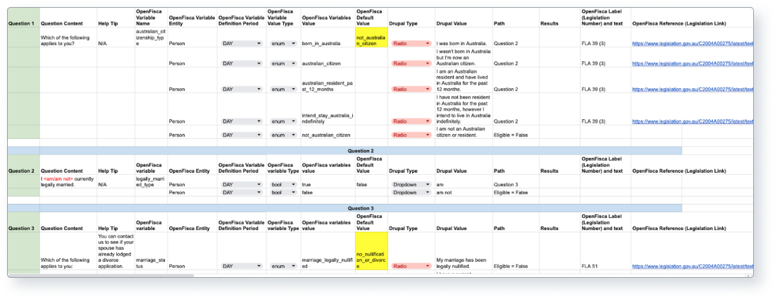 Our final process in the rules analysis was to create a spreadsheet that could be used by both the OpenFisca and Drupal developers. The spreadsheet included the text for the webform questions, the corresponding OpenFisca variables, as well as help text and user journey pathways. The screenshot below shows part of the spreadsheet for divorce eligibility.