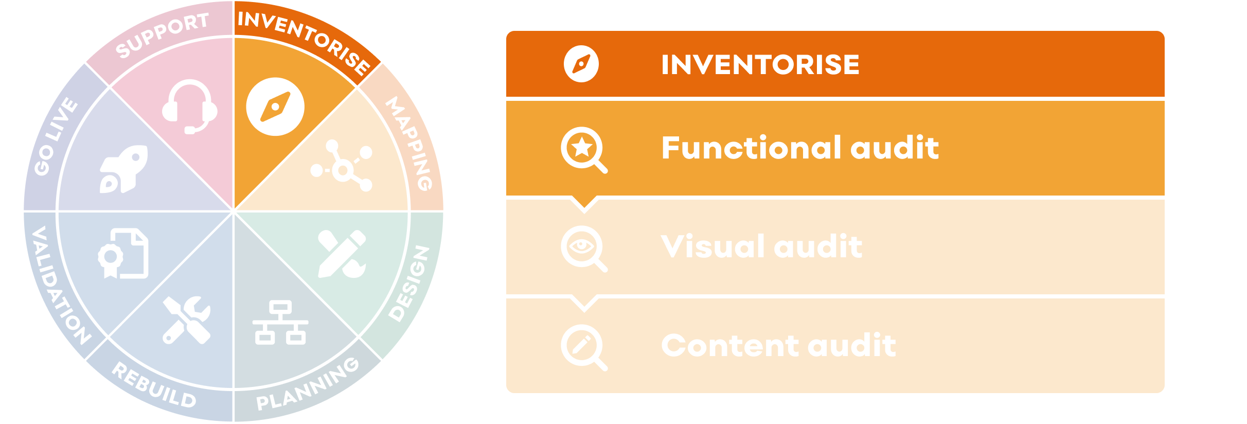 The functional audit is step 1 of a 24 step project delivery process Salsa has designed for migrating (or upgrading) sites from a legacy or proprietary CMS to Drupal 9.