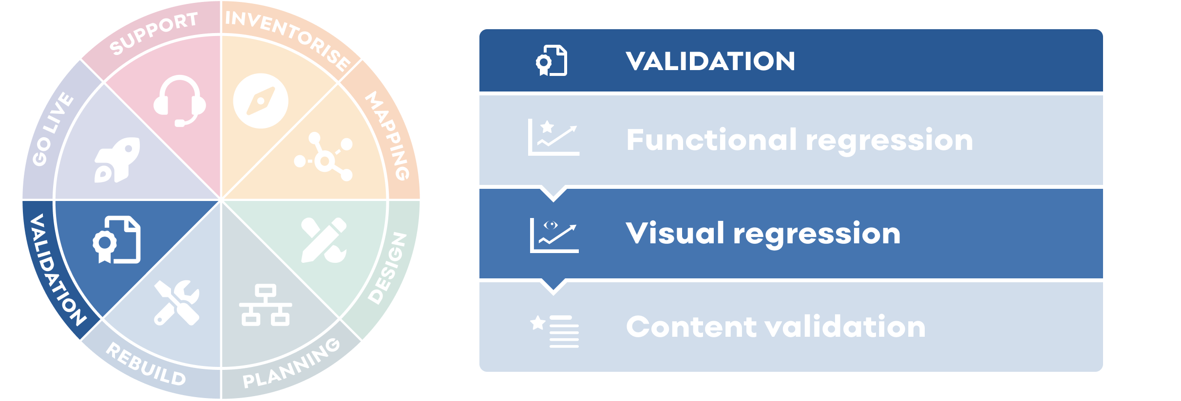 The visual regression is step 17 of a 24 step project delivery process Salsa has designed for migrating (or upgrading) sites from a legacy or proprietary CMS to Drupal 9.