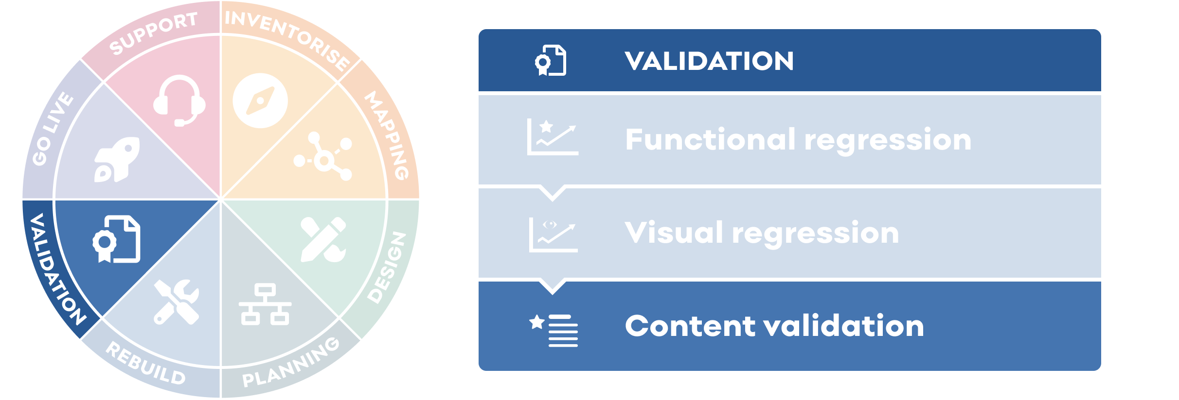 The content validation is step 18 of a 24 step project delivery process Salsa has designed for migrating (or upgrading) sites from a legacy or proprietary CMS to Drupal 9.