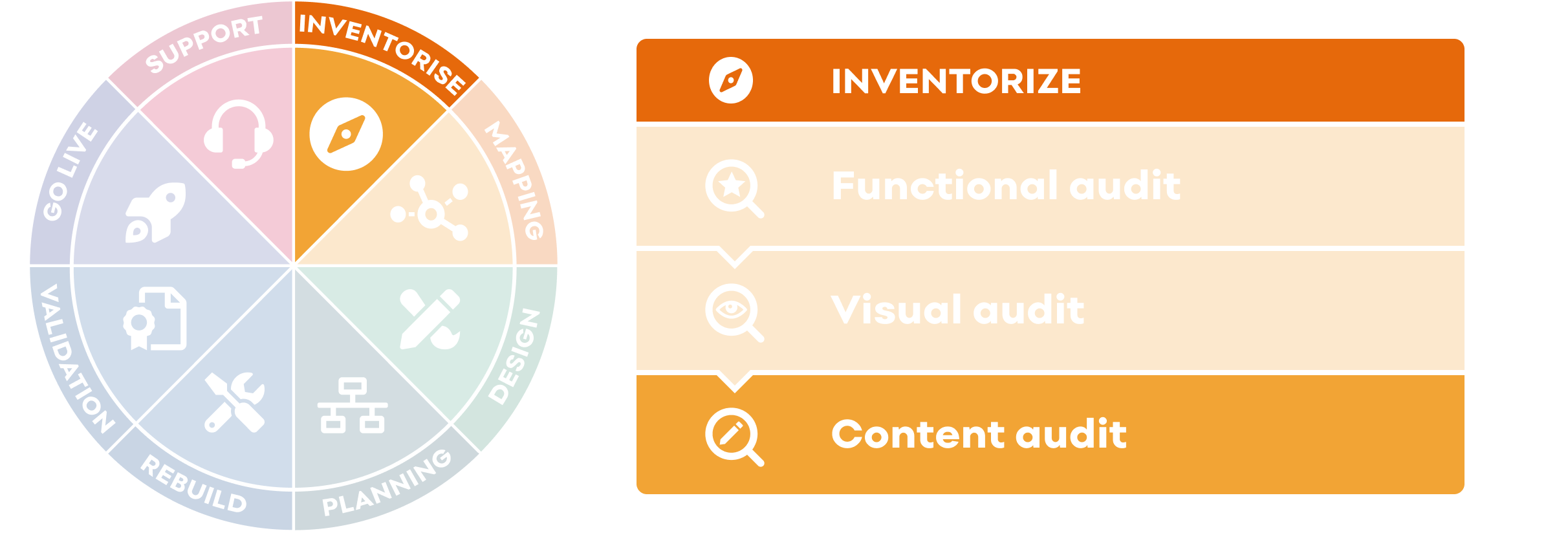 The content audit is step 3 of a 24 step project delivery process Salsa has designed for migrating (or upgrading) sites from a legacy or proprietary CMS to Drupal 9.