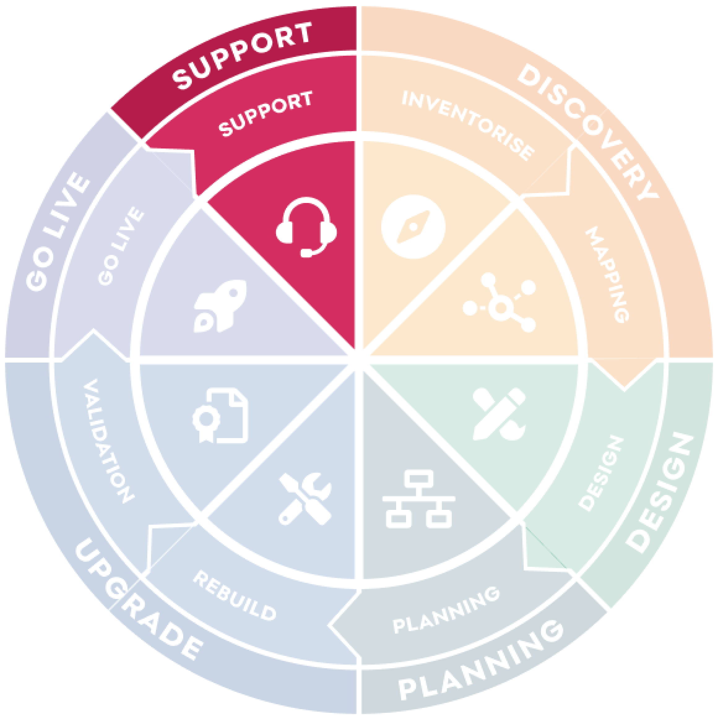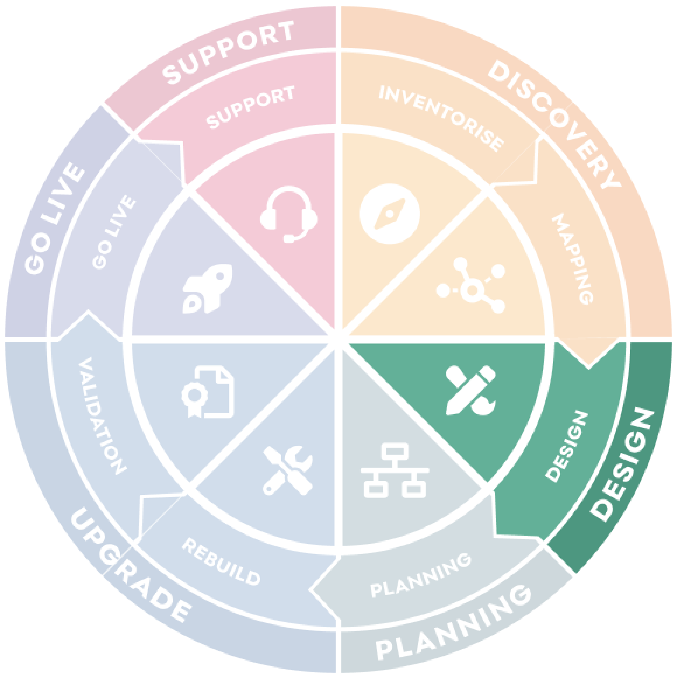 4. Upgrade | Upgrade involves core rebuild and migrate activities. Features are developed, UI is themed and content is migrated. |