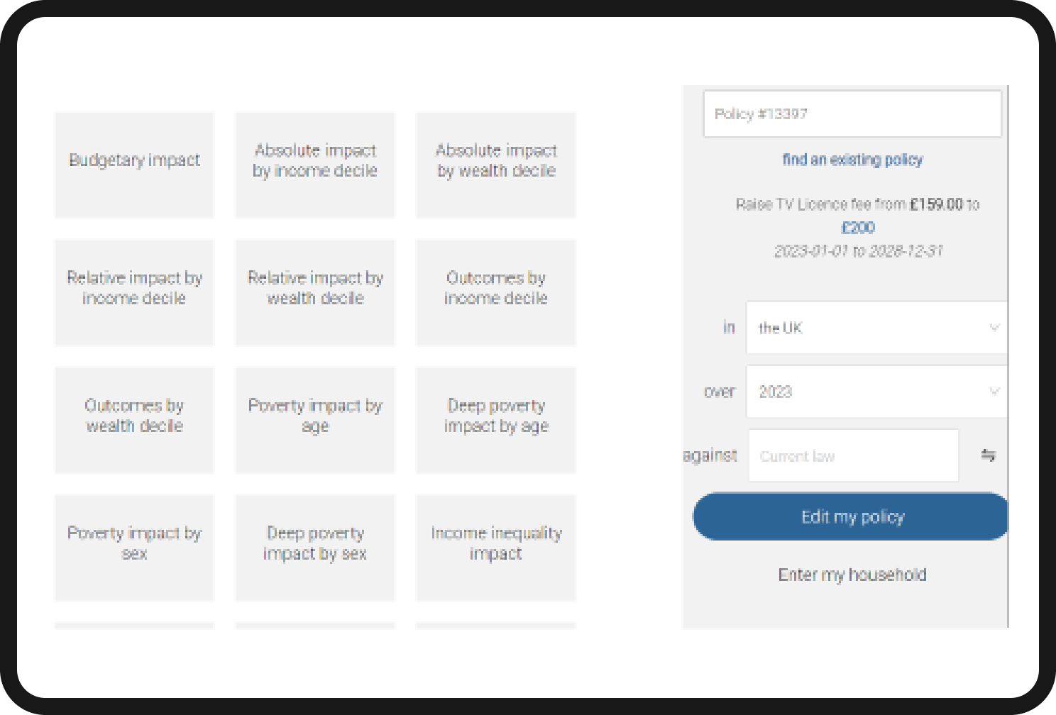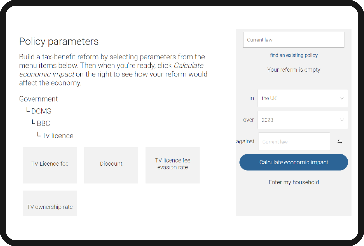 Once you’ve selected the policy parameters, you can model the effect of changes on both the government and citizens. For example, let’s say you change the TV licence fee from £159 to £200. Next, click on the Calculate economic impact button and then Budgetary impact to see how this one change would affect the government’s income.