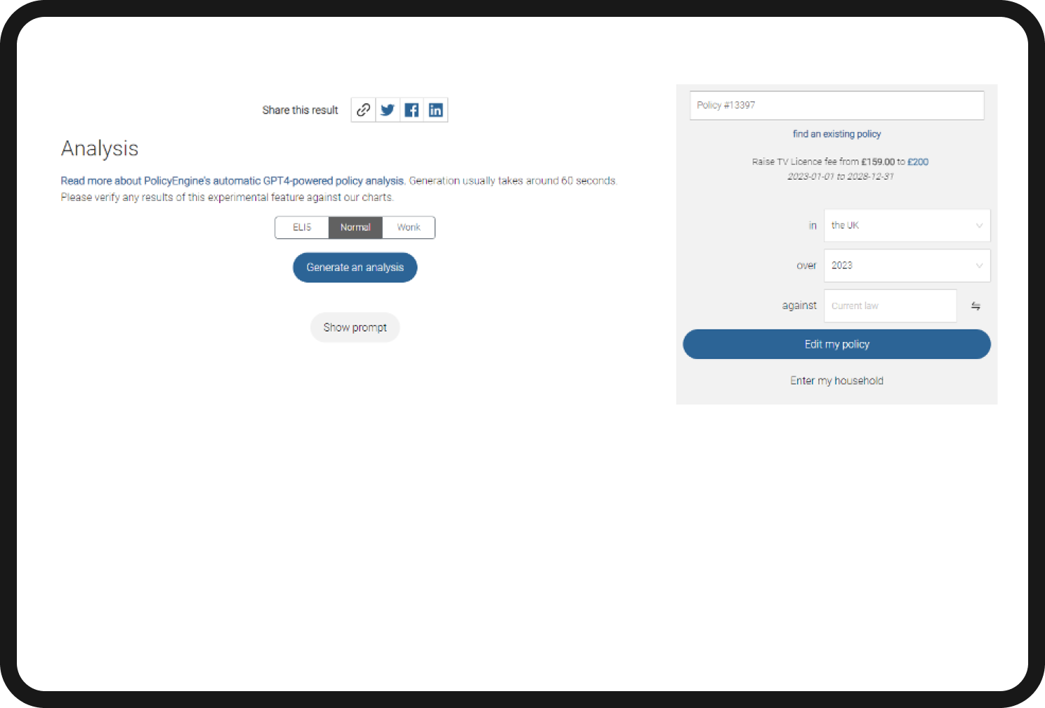 When you click on the Analysis link on the left, you can either generate the ChatGPT analysis within the PolicyEngine website or view the prompt and copy and paste it.