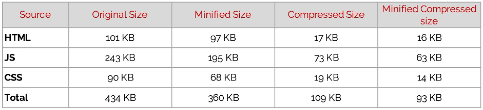 Compressing components: All modern browsers support compressed components. Components like HTML, CSS, and XML files can be loaded in compressed form on the server side. This reduces the load on the server. When these files are transferred to the browser, a decompression process occurs. The following figure shows the impact of compression on various components.